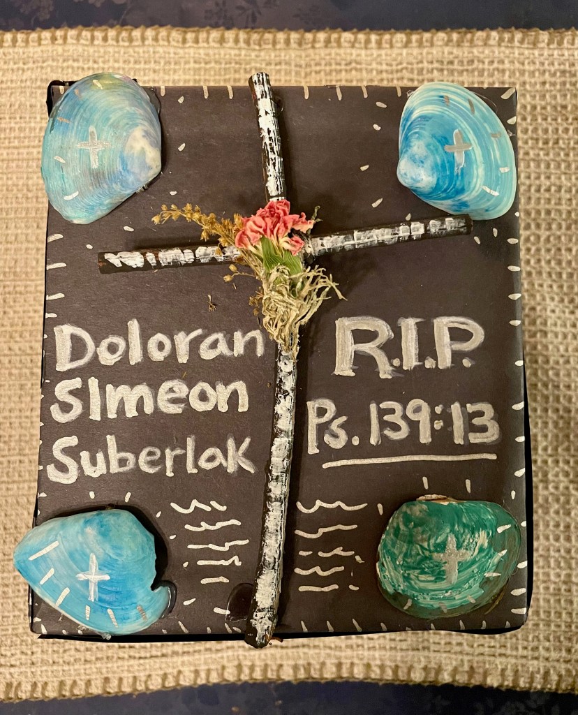 I did kneel down and place the box myself, which I had decorated last night with shells and a wooden cross, and scriptures and words of hope. Though I started this little project with some diffidence, the very act of daubing paint on a “sarcophagus” that contained my own child, immediately brought forth tears. I must admit there has never been a more primal experience of art-making.