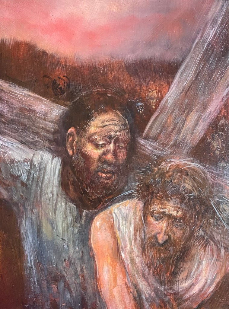 The panel that depicts Simon of Cyrene helping Jesus to carry his cross is particularly meaningful, since it is an emblem of true friendship. The man who commissioned these from me, has not ceased to carry this burden in a special way with me, through his patience and generous spirit.