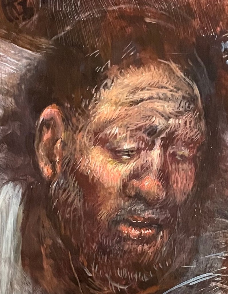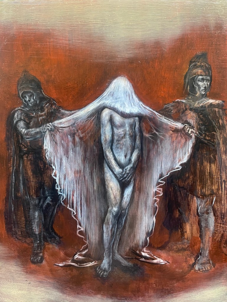 In 2016, I was commissioned by a client to make a series of 15 paintings: The 14 Stations of the Cross, plus a panel representing The Resurrection of Christ. “The Stations” or “Way of the Cross” is a Christian devotion that has been practiced for centuries. It usually consists of a series of vignettes of Jesus during the final hours of his suffering and death by execution. In Roman Catholicism, The Stations begin with Jesus being condemned to death by Pontius Pilate, and end with his burial. Usually these scenes are depicted on small panels that serve as markers or “stations” along a pathway, often inside of a sanctuary and sometimes outdoors. Pilgrims therefore can walk from station to station on the Way of the Cross in solemn meditation on these events. The addition of a panel to represent the Resurrection of Christ is a variation on the traditional 14 Stations, and this was something the client wanted.