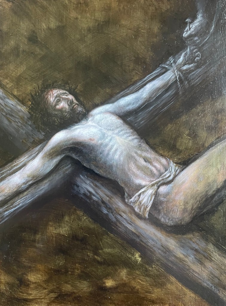 Although there is a part of me that wants more than anything for them to be finished, to bring this story to an end, and send them off into the world, I’ve become puzzled as to how to think of them. They are not what I imagined they would be. We had talked originally about making them bright, and romantic and beautiful—in contrast with the deathly subject matter. I had planned for them a pallet of flesh tones dominated by rose. I wanted these paintings to visually re-frame the sufferings of Christ with the assurance of the spiritual goodness and beauty of his sacrifice.