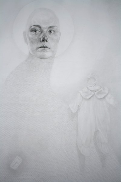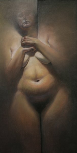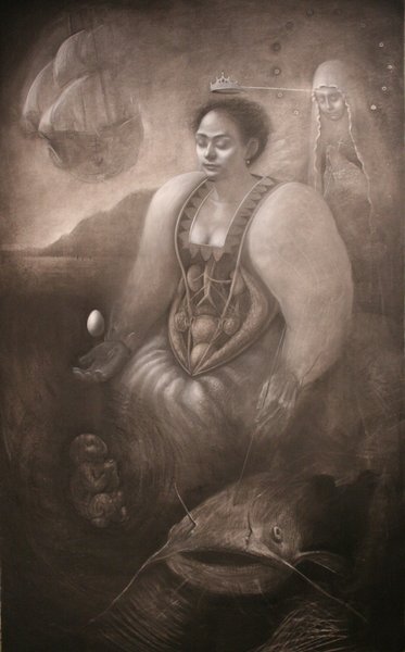 “The first few drawings here represent a small selection of work done during my graduate studies at The Pennsylvania Academy from 2006 to 2008. … The large scale drawing entitled, ‘The Princess Who Came from the Coast,’ completed…after my conversion to Catholicism, serves as a kind of epilogue … Whereas the previous female figures were aggressively cropped, cut off from any physical location, and seemingly trapped in an alienated struggle, ‘The Princess’ is not isolated, but rather surrounded by symbolic figures to which she relates in a cosmic drama – figures that either harm or help her.”